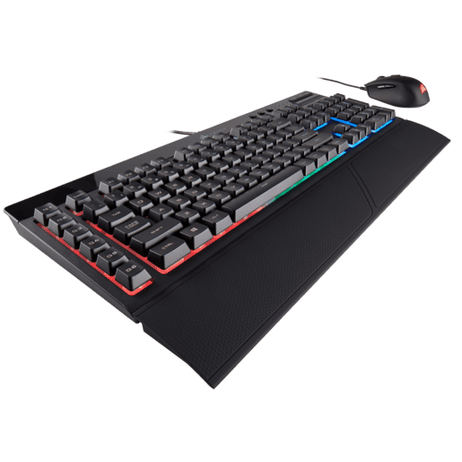 Teclado K55 RGB: 3 zonas de iluminación dinámica, 6 teclas programables a través de macros, controles de volumen y multimedia, teclas silenciosas, pulsación de teclas simultaneas, reposa-muñecas desmontable, bloqueo de tecla de Windows para evitar interrupciones.